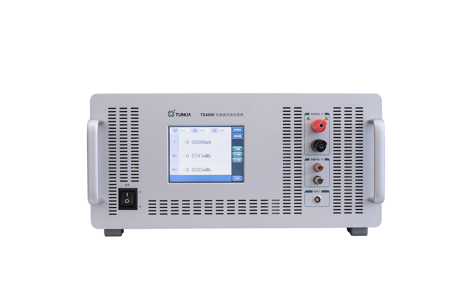 The TS4000 is a dedicated system for measuring the DC magnetic properties of soft magnetic materials. It consists of a DC excitation and measurement unit, Type-A or Type-B permeameters (optional), solenoids (optional), electromagnets (optional), and software. The device can directly measure the DC magnetic parameters of soft magnetic ring specimens or other closed magnetic circuit samples by winding coils around them and generating corresponding magnetic property curves. It can also measure the magnetic parameters of open magnetic circuit samples by using optional Type A/B permeameters, solenoids, or electromagnets.